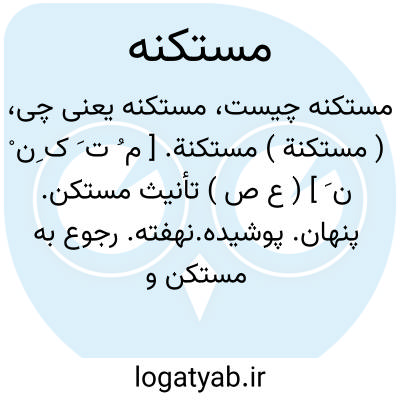 ( مستکنة ) مستکنة. [ م ُ ت َ ک ِن ْ ن َ ] ( ع ص ) تأنیث مستکن. پنهان. پوشیده.نهفته. رجوع به مستکن و استکنان شود: فینفع من وجع الظهر و.... الریاح المستکنة فیها. ( ابن البیطار ). || ( اِ ) کینه و حقد. ( از اقرب الموارد ) ( از منتهی الارب ).