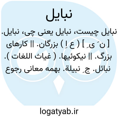 لغت نامه دهخدا نبایل. [ ن َ ی ِ ] ( ع اِ ) بزرگان. || کارهای بزرگ. || نیکوئیها. ( غیاث اللغات ). نبائل. ج ِ نبیلة. بهمه معانی رجوع به نبائل و نبیلة شود.