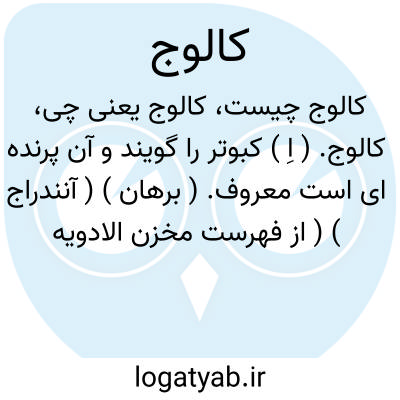 کالوج. ( اِ ) کبوتر را گویند و آن پرنده ای است معروف. ( برهان ) ( آنندراج ) ( از فهرست مخزن الادویه ).حمام. ( از فهرست مخزن الادویه ). رجوع به کبوتر شود. || انگشت کوچک را هم می گویند، که عربان خنصر خوانند. ( برهان ). انگشت کوچک را هم می گویند و کلیج نیز گویند. ( آنندراج ): هر که طالب این حدیث است قبله جمله این است و اشارت به انگشت کالوج کرد یکی بگرفته و یکی بگشوده. ( تذکرةالاولیاء ). کالوچ. و رجوع به کالوچ شود.