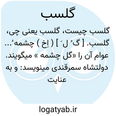 گلسب. [ گ ُ ل َ ] ( اِخ ) چشمه ٔ... عوام آن را «گل چشمه » میگویند. دولتشاه سمرقندی مینویسد: و به عنایت الهی چند وقت است تا همت عالی بر خیبری گماشته که آب چشمه گل «گلسب » را که از مشاهیر عیون خراسان است و از منزهات جهان و در اعلی ولایت طوس واقع است... رجوع به مقدمه مجالس النفائس ص یدویه و یو شود. در تداول مردم مشهد آنرا گیلاس خوانند. و رجوع به چشمه گلسب و چشمه گیلاس و مطلعالشمس از ص 176 به بعد شود.