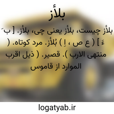 بلأز. [ ب َ ءَ ] ( ع ص، اِ ) بُلأز. مرد کوتاه. ( منتهی الارب ). قصیر. ( ذیل اقرب الموارد از قاموس ). || کودک سطبر سخت. ( منتهی الارب ) ( از ذیل اقرب الموارد از قاموس ). || شیطان. ( منتهی الارب ) ( ذیل اقرب الموارد از قاموس ). ابلیس. عزازیل. شیخ نجدی. ابومرة. ابولبینی. ابوخلاف. خناس. ابوالعیزار. دیو.