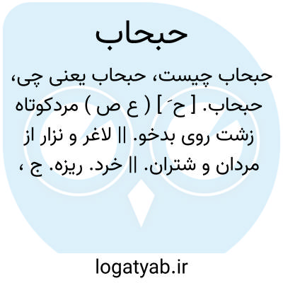 حبحاب. [ ح َ ] ( ع ص ) مردکوتاه زشت روی بدخو. || لاغر و نزار از مردان و شتران. || خرد. ریزه. ج، حباحِب. || ( اِخ ) نام شمشیر عمروبن خلی. ( آنندراج ).