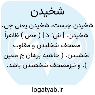 شخیدن. [ ش َ دَ ] ( مص ) ظاهراً مصحف شخلیدن و مقلوب لخشیدن. ( حاشیه برهان چ معین ). و نیزمصحف شخشیدن باشد. لغزیدن و فروافتادن از جایی. ( برهان ). شخشیدن. بیهقی در تاج المصادر در ترجمه ذریر گوید: بشخیدن چشم در سر. || وانگریستن و امعان نظر کردن. ( ناظم الاطباء ). || با تندی و درشتی و ترشرویی نگریستن. || پژمرده شدن. ناتوان و سست و ضعیف گشتن. شخولیدن. || به حال آمدن پس از افتادن. || نگاه داشتن خود را هنگام غلطیدن. ( ناظم الاطباء ). || صورتی است از چخیدن به معنی ستیزه کردن: