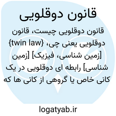 {twin law} [زمین شناسی، فیزیک] [زمین شناسی] رابطه ای دوقلویی در یک کانی خاص یا گروهی از کانی ها که محور دوقلویی یا مرکز دوقلویی یا صفحۀ دوقلویی را مشخص می کند [فیزیک] گزاره ای که بیانگر ارتباط بین دو یا چند جزءِ سازندۀ بلور دوقلوست