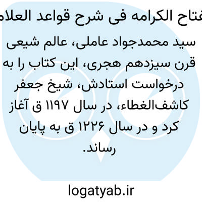 [ویکی شیعه] مفتاح الکرامه فی شرح قواعد العلامه (کتاب). مِفْتاحُ الْکرامَة فی شَرْحِ قَواعِدِ الْعَلّامَه، یکی از شرح های کتاب قواعد الاحکام نوشتهٔ علامه حلی (متوفای ۷۲۶ق) است. نویسندهٔ این کتاب سید محمدجواد حسینی عاملی از علمای قرن سیزدهم است. او کتاب را به درخواست استادش شیخ جعفر کاشف الغطاء نوشته است. این کتاب تعدادی از ابواب فقهی را دربردارد و در آن آرای فقیهان در رابطه با هر مسئله گردآوری شده است.