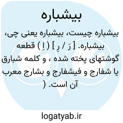 بیشباره. [ رَ / رِ ] ( اِ ) قطعه گوشتهای پخته شده، و کلمه شبارق یا شفارج و فیشفارج و بشارج معرب آن است. ( از المعرب جوالیقی ص 204 ). اما ظاهراً این کلمه تصحیفی از پیشباره بمعنی خوانچه تنقلات و پیش غذا است. رجوع به پیشپاره و حاشیه معرب جوالیقی چ احمد شاکر ص 204 شود.