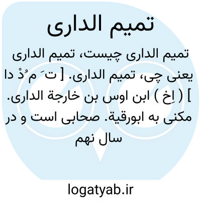 تمیم الداری. [ ت َ م ُدْ دا ] ( اِخ ) ابن اوس بن خارجة الداری. مکنی به ابورقیة. صحابی است و در سال نهم از هجرت اسلام آورد. بخاری و مسلم هیجده حدیث از وی روایت کرده اند و در سال چهلم از هجرت در فلسطین درگذشت و مقریزی کتابی دارد بنام «ضوءالساری فی معرفة خبر تمیم الداری ». ( از اعلام زرکلی ج 1 صص 165-166 ). رجوع به الاصابه ج 1 ص 197 و عیون الاخبار ج 1 ص 297 و سیرة عمربن عبدالعزیز ص 14 و تاریخ الخلفا ص 126 و تاریخ گزیده ص 163 و 220 و 240 و عقدالفرید ج 2 ص 196 و ج 3 ص 351 وج 7 ص 252 و 307 و قاموس الاعلام ترکی و اخبار مصر و القاهره ص 82 و حبیب السیر چ خیام ج 4 ص 677 و 678 شود.
