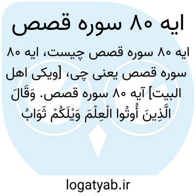 [ویکی اهل البیت] آیه 80 سوره قصص. وَقَالَ الَّذِینَ أُوتُوا الْعِلْمَ وَیْلَکُمْ ثَوَابُ اللَّهِ خَیْرٌ لِمَنْ آمَنَ وَعَمِلَ صَالِحًا وَلَا یُلَقَّاهَا إِلَّا الصَّابِرُونَ