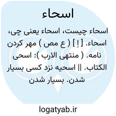 اسحاء. [ اِ ] ( ع مص ) مهر کردن نامه. ( منتهی الارب ): اسحی الکتاب. || اسحیه نزد کسی بسیار شدن. بسیار شدن اسحیه نزد کسی. ( منتهی الارب ). خداوند سحاء بسیار شدن. ( تاج المصادر بیهقی ).