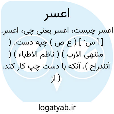 اعسر. [ اَ س َ ] ( ع ص ) چپه دست. ( منتهی الارب ) ( ناظم الاطباء ) ( آنندراج ). آنکه با دست چپ کار کند. ( از متن اللغة ). کسی که با دست چپ کار کند. مؤنث: عَسْرا. ج، عُسر، عُسران. ( از اقرب الموارد ). چپ، ( المصادر زوزنی ) ( مهذب الاسماء نسخه خطی ). چپ مقابل یسر. ( یادداشت بخط مؤلف ). || حمام اعسر؛ کبوتر که در بال چپ آن سپیدی باشد. ( منتهی الارب ) ( از متن اللغة )( ناظم الاطباء ). || یوم اعسر؛ روز سخت یا روز بد. ( منتهی الارب ) ( ناظم الاطباء ). روز شوم. ( از متن اللغة ). روز سخت یا روز شوم. ( از اقرب الموارد ).