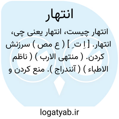 انتهار. [ اِ ت ِ ] ( ع مص ) سرزنش کردن. ( منتهی الارب ) ( ناظم الاطباء ) ( آنندراج ). منع کردن و در اساس چنین آمده: استقبال کردن کسی را با کلامی منعکننده. ( از اقرب الموارد ). بازمانانیدن. ( تاج المصادر بیهقی ). بانگ برزدن. ( یادداشت مؤلف ). || ناایستادن خون رگ. ( منتهی الارب ) ( ناظم الاطباء ) ( آنندراج ). قطع نشدن خون رگ.( از اقرب الموارد ). || روان گردیدن شکم. ( منتهی الارب ) ( ناظم الاطباء ) ( آنندراج ). استطلاق بطن. ( از اقرب الموارد ). روان شدن شکم. اسهالی شدن شکم.