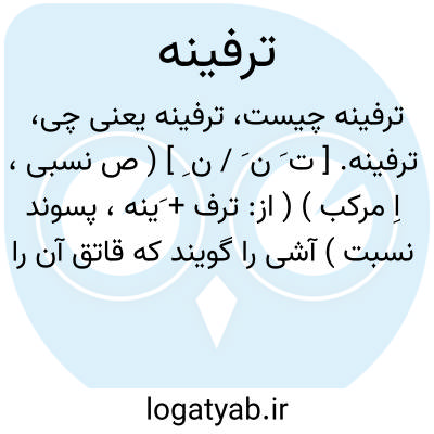ترفینه. [ ت َ ن َ / ن ِ ] ( ص نسبی، اِ مرکب ) ( از: ترف + َینه، پسوند نسبت ) آشی را گویند که قاتق آن را قراقروت کرده باشند. ( برهان ) ( از فرهنگ جهانگیری ). آشی است که قاتق آن از تَرْف کنند.( فرهنگ رشیدی ). آش قراقروت. ( انجمن آرا ) ( از آنندراج ). آش تَرْف و تَرْفبا. ( ناظم الاطباء ):