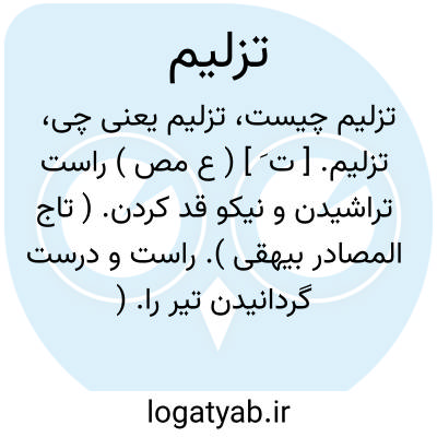 تزلیم. [ ت َ ] ( ع مص ) راست تراشیدن و نیکو قد کردن. ( تاج المصادر بیهقی ). راست و درست گردانیدن تیر را. ( منتهی الارب ) ( آنندراج ) ( ناظم الاطباء ). راست و برابر گردانیدن چیزی را. ( از اقرب الموارد ) ( از المنجد ) ( از متن اللغة ). || نرم و تابان کردن. ( منتهی الارب ) ( آنندراج ) ( ناظم الاطباء ). نرم گردانیدن چیزی را. ( از اقرب الموارد ) ( از المنجد ). || بگردانیدن آسیا را و گرفتن کنارهای آن. ( منتهی الارب ) ( آنندراج )( ناظم الاطباء ) ( از متن اللغة ) ( از اقرب الموارد ) ( ازالمنجد ). || بد کردن غذای کسی را. ( منتهی الارب ) ( از آنندراج ) ( ناظم الاطباء ) ( از اقرب الموارد ) ( از متن اللغة ) ( از المنجد ). || اصلاح کردن سنگ جهت آسیا و هر چیز که کناره های آنرا بگیرند. ( از متن اللغة ). || پر کردن ظرف. ( از متن اللغة ). || اندک کردن عطاء. ( تاج المصادر بیهقی ) ( از متن اللغة ) ( از اقرب الموارد ) ( از المنجد ).