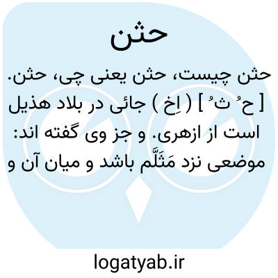 حثن. [ ح ُ ث ُ ] ( اِخ ) جائی در بلاد هذیل است از ازهری. و جز وی گفته اند: موضعی نزد مَثَلَّم باشد و میان آن و مکة دو روز راه است. سلمی بن مقعد قرمی گوید: