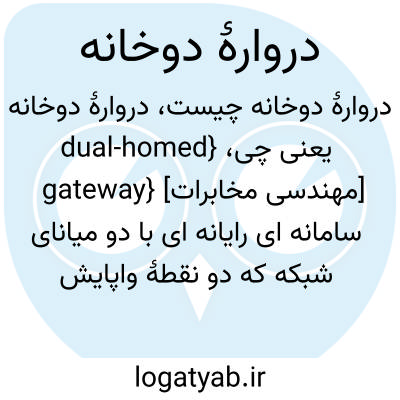 {dual-homed gateway} [مهندسی مخابرات] سامانه ای رایانه ای با دو میانای شبکه که دو نقطۀ واپایش امن در بین دو شبکۀ قرارداد اینترنت (IP ) مختلف و دو نشانۀ قرارداد اینترنت (IP ) مختلف ایجاد می کند