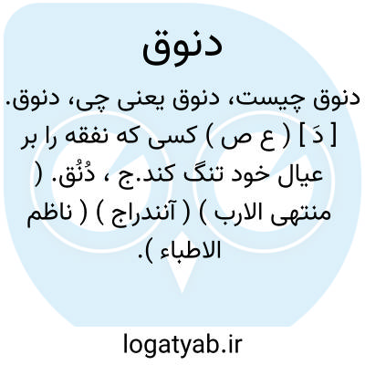 دنوق. [ دَ ] ( ع ص ) کسی که نفقه را بر عیال خود تنگ کند.ج، دُنُق. ( منتهی الارب ) ( آنندراج ) ( ناظم الاطباء ).