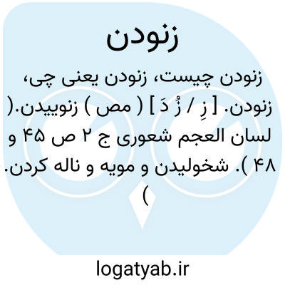 زنودن. [ زِ / زُ دَ ] ( مص ) زنوییدن.( لسان العجم شعوری ج 2 ص 45 و 48 ). شخولیدن و مویه و ناله کردن. ( ناظم الاطباء ). || خفتن و خوابیدن و غنودن. ( ناظم الاطباء ). رجوع به زنوییدن شود.