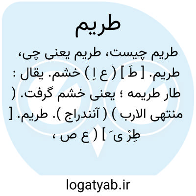 طریم. [ طَ ] ( ع اِ ) خشم. یقال: طار طریمه؛ یعنی خشم گرفت. ( منتهی الارب ) ( آنندراج ).