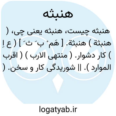 ( هنبثة ) هنبثة. [ هَم ْ ب َ ث َ ] ( ع اِ ) کار دشوار. ( منتهی الارب ) ( اقرب الموارد ). || شوریدگی کار و سخن. ( منتهی الارب ). ج، هنابث. ( اقرب الموارد ). رجوع به هنابذ شود.