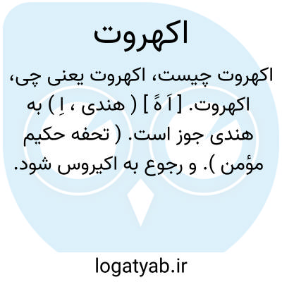 لغت نامه دهخدا اکهروت. [ اَ هََ ] ( هندی، اِ ) به هندی جوز است. ( تحفه حکیم مؤمن ). و رجوع به اکیروس شود.