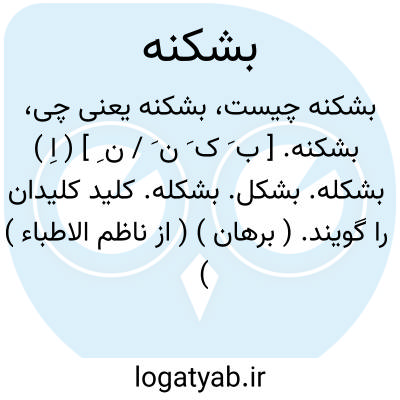 بشکنه. [ ب َ ک َ ن َ / ن ِ ] ( اِ ) بشکله. بشکل. بشکله. کلید کلیدان را گویند. ( برهان ) ( از ناظم الاطباء ) ( انجمن آرا ) ( آنندراج ) ( فرهنگ نظام ). بشکله. ( شرفنامه منیری ). و رجوع به شعوری ج 1 ورق 209 و بشکل و بشکله شود. || تنه درخت. ( ناظم الاطباء ). || نام نوایی است از موسیقی. ( انجمن آرا ) ( آنندراج ):