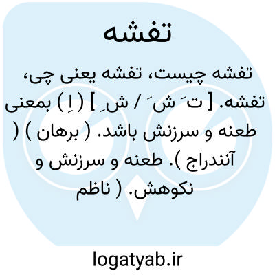 تفشه. [ ت َ ش َ / ش ِ ] ( اِ ) بمعنی طعنه و سرزنش باشد. ( برهان ) ( آنندراج ). طعنه و سرزنش و نکوهش. ( ناظم الاطباء ). طعنه.( فرهنگ رشیدی ). || ( مص ) طعنه زدن. ( صحاح الفرس ). طعنه زدن و سرزنش کردن را نیز گویند. ( برهان ) ( آنندراج ). رجوع به تفش و تفشل و ماده بعد شود.
