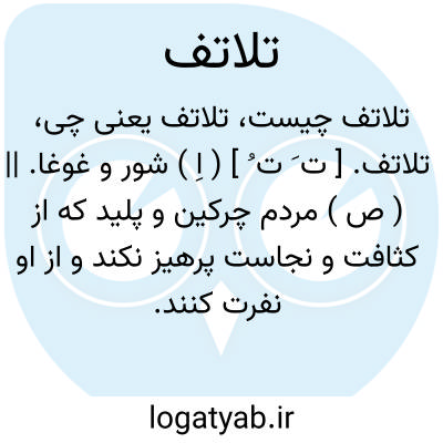 لغت نامه دهخدا تلاتف. [ ت َ ت ُ ] ( اِ ) شور و غوغا. || ( ص ) مردم چرکین و پلید که از کثافت و نجاست پرهیز نکند و از او نفرت کنند. ( ناظم الاطباء ). رجوع به تلاتوف شود.