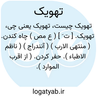 لغت نامه دهخدا تهویک. [ ت َ ] ( ع مص ) چاه کندن. ( منتهی الارب ) ( آنندراج ) ( ناظم الاطباء ). حفر کردن. ( از اقرب الموارد ). رجوع به تهییک شود. || به حماقت نسبت کردن کسی را. ( از اقرب الموارد ).