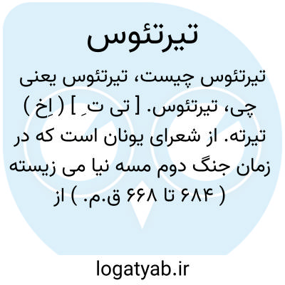 تیرتئوس. [ تی ت ِ ] ( اِخ ) تیرته. از شعرای یونان است که در زمان جنگ دوم مسه نیا می زیسته ( 684 تا 668 ق.م. ) از تیرتئوس آثار فراوانی در دست نیست و غالب اشعار وی نابود شده است. ( از اعلام تمدن قدیم فوستل دوکلانژ ). رجوع به تیرته شود.