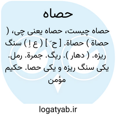 ( حصاة ) حصاة. [ ح َ ] ( ع اِ ) سنگ ریزه. ( دهار ). ریگ. جمرة. رمل. یکی سنگ ریزه و یکی حصا. حکیم مؤمن گوید: رادع و مجفف است و سائیده او مثل غبار جهت نزف الدم جراحات و رفع ورم مفید است و انداختن آن در کوزه آب مصلح غلظت آن و مقوی احشاست. ( تحفه ). || سنگ که در مثانه بود. سنگ که در گرده بود. سنگ که در مثانه یا کلیه و جز آن پدید آید از کمیز منجمد که همچو سنگ ریزه گردد یا از تحجر خلطی غلیظ به علت استعمال اغذیه لزجه. || عقل. خرد. ( مهذب الاسماء ). هوش. ( منتهی الارب ). رای.