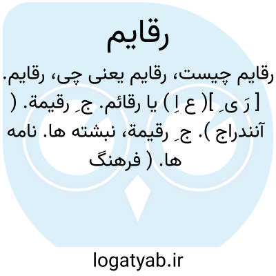 لغت نامه دهخدا رقایم. [ رَ ی ِ ]( ع اِ ) یا رقائم. ج ِ رقیمة. ( آنندراج ). ج ِ رقیمة، نبشته ها. نامه ها. ( فرهنگ فارسی معین ). || ج ِ رقیم. ( ناظم الاطباء ). رجوع به رقیم و رقیمة شود.