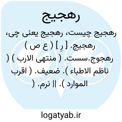 رهجیج. [ رِ ] ( ع ص ) رهجوج.سست. ( منتهی الارب ) ( ناظم الاطباء ). ضعیف. ( اقرب الموارد ). || نرم. ( منتهی الارب ) ( از ناظم الاطباء ). ناعم. ( از اقرب الموارد ). رجوع به رهجوج شود.