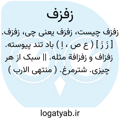 زفزف. [ زَ زَ ] ( ع ص، اِ ) باد تند پیوسته. زفزاف و زفزافة مثله. || سبک از هر چیزی. شترمرغ. ( منتهی الارب ) ( آنندراج ) ( ناظم الاطباء ). رجوع به زفزاف و زفزافة شود.