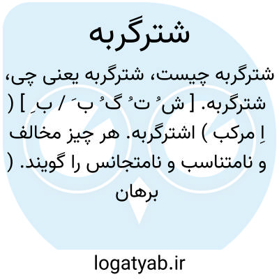 شترگربه. [ ش ُ ت ُ گ ُ ب َ / ب ِ ] ( اِ مرکب ) اشترگربه. هر چیز مخالف و نامتناسب و نامتجانس را گویند. ( برهان ). هر چیز مخالف و نامناسب و نامشابه. ( غیاث اللغات ). هرچیز ناموافق و نامتناسب و مخالف بزرگ و کوچک مثل شتر و گربه. ( انجمن آرا ) ( آنندراج ). چیزهای بی مناسبت در خوبی و بدی و پستی و بلندی. ( فرهنگ نظام ). || دو چیز را نیز شترگربه گویند که در غایت بلندی و پستی و کوچکی و بزرگی باشد. ( برهان ):