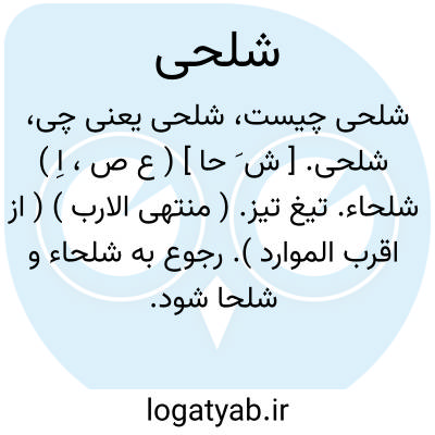 لغت نامه دهخدا شلحی. [ ش َ حا ] ( ع ص، اِ ) شلحاء. تیغ تیز. ( منتهی الارب ) ( از اقرب الموارد ). رجوع به شلحاء و شلحا شود.شلحی. [ ] ( اِخ ) شهرکی است [ به ماوراءالنهر ] که اندر وی مسلمانان و ترکانند و جای بازرگانان است. ( حدود العالم ).