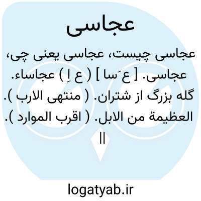 لغت نامه دهخدا عجاسی. [ ع َسا ] ( ع اِ ) عجاساء. گله بزرگ از شتران. ( منتهی الارب ). العظیمة من الابل. ( اقرب الموارد ). || پاره ای از شب. ( منتهی الارب ). رجوع به عجاساء شود.