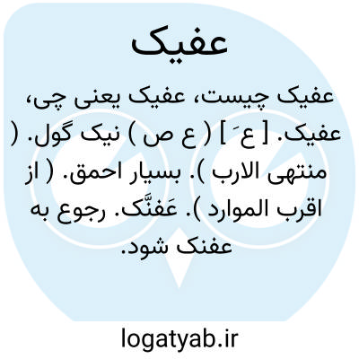 لغت نامه دهخدا عفیک. [ ع َ ] ( ع ص ) نیک گول. ( منتهی الارب ). بسیار احمق. ( از اقرب الموارد ). عَفنَّک. رجوع به عفنک شود.