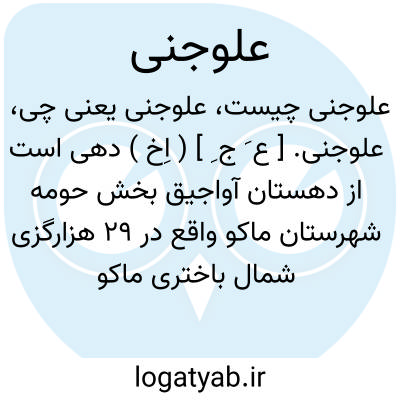 علوجنی. [ ع َ ج ِ ] ( اِخ ) دهی است از دهستان آواجیق بخش حومه شهرستان ماکو واقع در 29 هزارگزی شمال باختری ماکو و 7 هزارگزی شمال خاوری کلیساکندی. ناحیه ایست جلگه و سردسیر دارای 269 تن سکنه. آب آن از نهر گلی سوئی تأمین میشود. محصول آن غلات است. اهالی به زراعت و گله داری اشتغال دارند و صنایع دستی آنان جاجیم بافی است. راه آن ارابه رو است. این ده در دو محل به فاصله هزار گز قرار دارد که مشهور به علی جنی بالا و علی جنی پائین است و سکنه علی جنی بالا 150 تن است. اسم این ده را در اصل علی جنی میگویند. ( از فرهنگ جغرافیائی ایران ج 4 ).