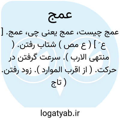 عمج. [ ع َ ] ( ع مص ) شتاب رفتن. ( منتهی الارب ). سرعت گرفتن در حرکت. ( از اقرب الموارد ). زود رفتن. ( تاج المصادر بیهقی ). || پیچ پیچان رفتن. ( منتهی الارب ). به چپ و راست پیچیدن در راه. ( اقرب الموارد ). || شناوری نمودن. این کلمه را مقلوب مَعَج دانسته اند. ( از منتهی الارب ) ( از اقرب الموارد ).