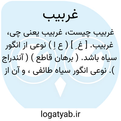 غربیب. [ غ ِ ] ( ع اِ ) نوعی از انگور سیاه باشد. ( برهان قاطع ) ( آنندراج ). نوعی انگور سیاه طائفی، و آن از بهترین انگورها باشد. || ( ص ) پیر که به خضاب موی را سیاه دارد. ( منتهی الارب ) ( آنندراج ). || سگ سیاه. ( دهار ). || اسود غربیب؛ سخت سیاه. ( منتهی الارب ) ( جهانگیری ). نیک سیاه. ( ترجمان علامه ٔجرجانی تهذیب عادل ص 73 ). سیاه و غالباً این کلمه رابه صورت تأکید آرند و گویند: اسود غربیب؛ یعنی سخت سیاه، چنانکه گویند: اسود فاقع و ابیض یَقَق ٌ. ج، غرابیب. ( از اقرب الموارد ). و اما در ترکیب «غرابیب سود» سود بدل است زیرا تأکید الوان مقدم نمی شود. ( ازمنتهی الارب ) ( اقرب الموارد ). رجوع به غرابیب شود.