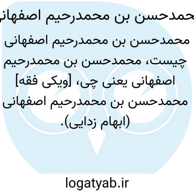 [ویکی فقه] محمدحسن بن محمدرحیم اصفهانی (ابهام زدایی). محمدحسن بن محمدرحیم اصفهانی ممکن است اشاره به اشخاص و شخصیت های ذیل باشد: • محمدحسن بن محمدرحیم لنجانی اصفهانی، عالم فاضل و ادیب شاعر، از فضلای قرن سیزدهم هجری در اصفهان• محمدحسن بن محمدرحیم اصفهانی (طبیب)، از علاقه مندان و دانشجویان طب در قرن سیزدهم هجری در اصفهان• محمدحسن بن محمدرحیم خوئی اصفهانی، از فضلاء قرن سیزدهم هجری در اصفهان• محمدحسن بن محمدرحیم خوش نویس اصفهانی، از خطاطین و خوش نویسان مشهور دوره قاجاریه در اصفهان• محمدحسن بن محمدرحیم شیخ الاسلام اصفهانی، عالم فاضل در اصفهان
