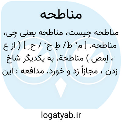 مناطحه. [ م ُ طَ/ طِ ح َ / ح ِ ] ( از ع، اِمص ) مناطحة. به یکدیگر شاخ زدن، مجازاً زد و خورد. مدافعه: این پادشاه که دایم عمر باد، در ایام مناطحه ایشان پای در دامن وقار کشید. ( ترجمه تاریخ یمینی چ 1 تهران ص 11 ).وجود دو فحل در رمه به مناطحت کشد. ( ترجمه تاریخ یمینی ایضاً ص 212 ). سلطان از کثرت لغط و سورت شطط ایشان تغافل نمود تا در آن مناطحه سر بر هم می زدند. ( ترجمه تاریخ یمینی ایضاً ص 332 ). بی مناطحه و مقابله از محامات ثغر اسلام و محافظت بیضه ملک تفادی نمودند.( المعجم چ مدرس رضوی چ 1 ص 5 ). رجوع به مناطحة شود.