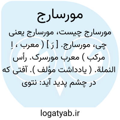 مورسارج. [ رَ ] ( معرب، اِ مرکب ) معرب مورسرک. رأس النملة. ( یادداشت مؤلف ). آفتی که در چشم پدید آید: نتوی عنبیه چهار نوع است و سبب هر چهار جراحت عنبیه باشد به سبب قرحه یا سببی از اسباب بادیه. و این نتو رانام عام مورسارج است لیکن نزدیک اهل صنعت هر نوعی را نامی است خاصه. اما نوع نخستین چنان باشد که طبقه ٔقرنیه را آفتی رسد و بشکافد و عنبیه از آن شکاف برآید و مقدار برآمدن او نزدیک باشد همچون سر مورچه، و بدین سبب او را رأس النمله گویند. و هرگاه که نگاه کند پندارد که بثره است و فرق میان بثره و رأس النمله آن است که تأمل کند تا لون چشم اکحل است، اگر ازرق، گر اشهل است و نیز تأمل کند تا سیاهی چشم کوژ گشته است و گردی او از نهاد خود بگردیده است یا کوچکتر شده است گرنه اگر کوچکتر شده است و شکل گردی او از نهاد خود بگردیده است نشان رأس النمله است بثره نیست... ( ذخیره خوارزمشاهی در بیماریهای چشم ) ( از نسخه خطی لغت نامه و ص 359 چاپی ). و رجوع به مورسرج شود.