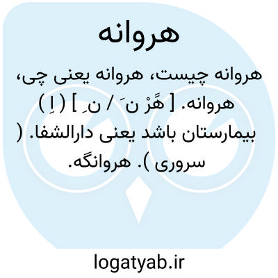 هروانه. [ هََرْ ن َ / ن ِ ] ( اِ ) بیمارستان باشد یعنی دارالشفا. ( سروری ). هروانگه. بیمارستان.دارالشفا. ( برهان ). || نزدیک پارسیان جای بادافراه یعنی جای عقوبت است. ( اسدی ). || شکنجه. ( برهان ). رجوع به هروانگه و هروانه گه شود.