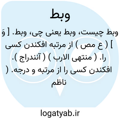 وبط. [ وَ ] ( ع مص ) از مرتبه افکندن کسی را. ( منتهی الارب ) ( آنندراج ). افکندن کسی را از مرتبه و درجه. ( ناظم الاطباء ). || بهره خسیس دادن. ( منتهی الارب ) ( آنندراج ) ( ناظم الاطباء ). || بازکردن زخم را. ( منتهی الارب ) ( آنندراج ). بازکردن و گشودن زخم را. ( ناظم الاطباء ). || بازداشتن کسی را از حاجت وی. ( منتهی الارب )( آنندراج ) ( ناظم الاطباء ). || سست رأی گردیدن. ( منتهی الارب ) ( آنندراج ) ( اقرب الموارد ) ( ناظم الاطباء ). و به این معنی به فتح اول و دوم نیز آمده. ( منتهی الارب ) ( آنندراج ). رجوع به وباطه و وبوط شود.