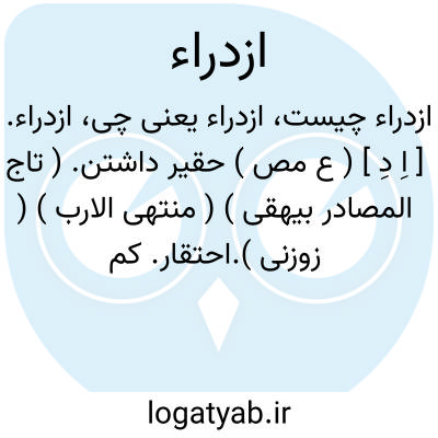 ازدراء. [ اِ دِ ] ( ع مص ) حقیر داشتن. ( تاج المصادر بیهقی ) ( منتهی الارب ) ( زوزنی ).احتقار. کم شمردن. تحقیر. خوار داشتن. استزراء: و لااقول لکم عندی خزائن اﷲ و لااعلم الغیب و لااقول انی ملک و لااقول للذین تزدری اعینکم لن یؤتیهم اﷲ خیراً اﷲ اعلم بما فی انفسهم انی اذاً لمن الظالمین. ( قرآن 31/11 )؛ نمیگویم بشما که نزد من است خزینه های خدا و نمیدانم غیب را و نمیگویم منم فرشته و نمیگویم به آنان بخواری مینگرند چشمهایتان را، ندهد ایشان را خدا خیری، خدا داناتر است به آنچه در نفسهایشان است که منم آگاه از ستمکاران. ( تفسیر ابوالفتوح چ 1ج 3 ص 62 ). || عیب کردن. ( منتهی الارب ).