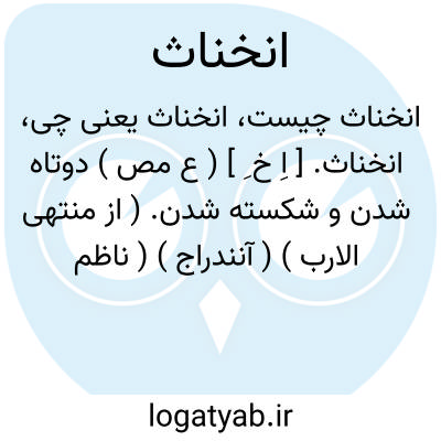 انخناث. [ اِ خ ِ ] ( ع مص ) دوتاه شدن و شکسته شدن. ( از منتهی الارب ) ( آنندراج ) ( ناظم الاطباء ).شکسته شدن یا دوتا شدن. ( تاج المصادر بیهقی ). شکسته شدن. دوتا شدن. ( مصادر زوزنی ). || نرم و فروهشته گردیدن. ( ناظم الاطباء ). نرم و خرد شدن. ( از اقرب الموارد ). || ( اِمص ) مأبونی. مخنثی.یقال: فیه انخناث و تخنث و خناثة. ( ناظم الاطباء ).