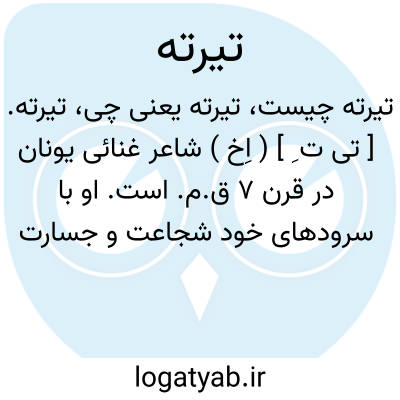 تیرته. [ تی ت ِ ] ( اِخ ) شاعر غنائی یونان در قرن 7 ق.م. است. او با سرودهای خود شجاعت و جسارت اسپارتی ها را در جنگ دوم مسنیه تجدید کرد. ( از لاروس ). رجوع به تیرتئوس شود.