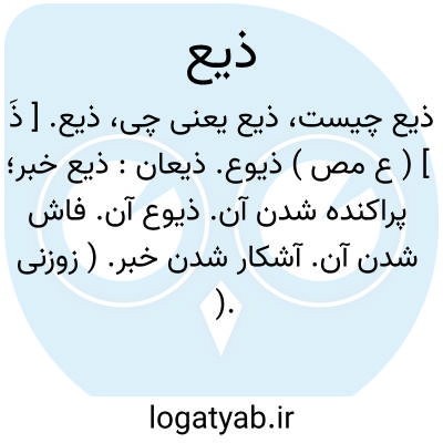 ذیع. [ ذَ ] ( ع مص ) ذیوع. ذیعان: ذیع خبر؛ پراکنده شدن آن. ذیوع آن. فاش شدن آن. آشکار شدن خبر. ( زوزنی ). بگستردن خبر. || آشکار کردن. ( تاج المصادر بیهقی ).