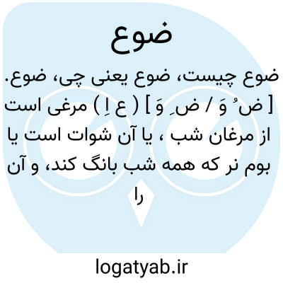 ضوع. [ ض ُ وَ / ض ِ وَ ] ( ع اِ ) مرغی است از مرغان شب، یا آن شوات است یا بوم نر که همه شب بانگ کند، و آن را چوکک هم گویند، یا مرغی است سیاه مانند زاغ پاکیزه گوشت. غاژ. غراب الزیتون. غراب الزرع. ج، اضواع، ضیعان. ( منتهی الارب ). بوم نر را نامند که بفارسی کول نر گویند. ( فهرست مخزن الادویه ). نوعی بوم. بوم نر. ( دهار ). کرک نر. ( مهذب الاسماء ). نوعی است از مرغان شب یا مرغی است که آن را کروان نیز گویند یا بوم نر یا مرغی است سیاه مانند غراب که خوش گوشت می باشد، و بعضی گفته اند نوعی است از مرغ که همه شب بانگ کند و آن را چوکک گویند. ( منتخب اللغات ).